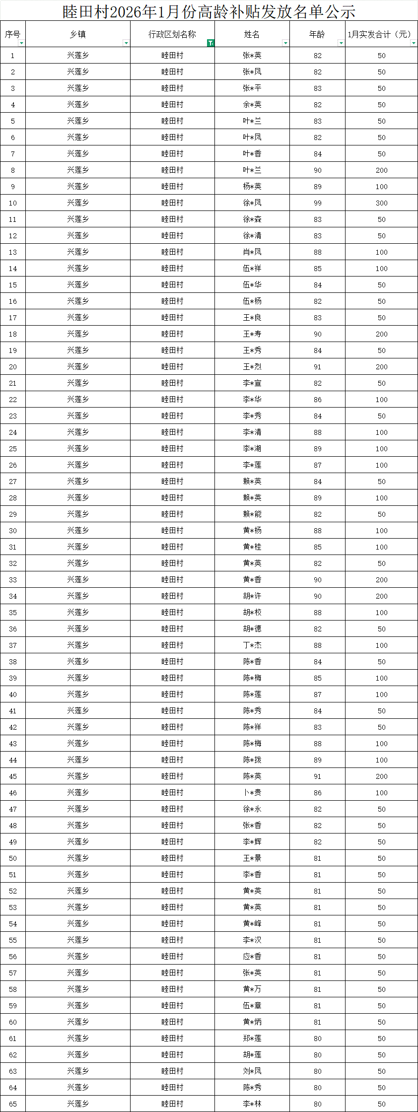 【養老服務】睦田村2026年1月份高齡補貼發放名單