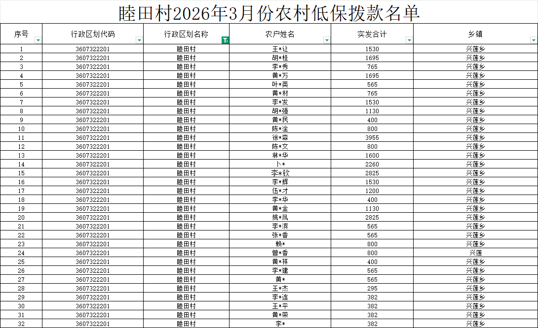 【社會救助】睦田村2026年3月份農(nóng)村低保撥款名單