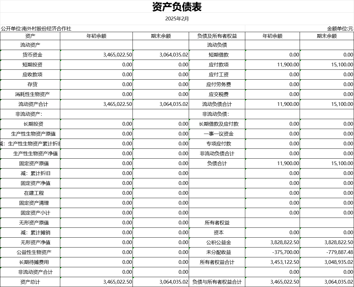 南外村股份經(jīng)濟(jì)合作社2025年2月份資產(chǎn)負(fù)債表公示