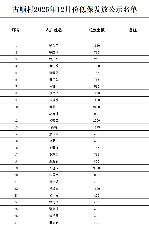 古順村2025年12月份低保發放公示名單