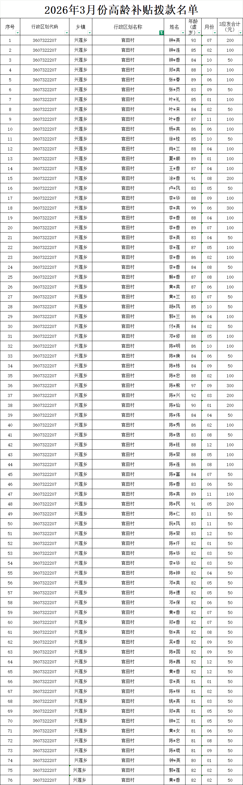 【養(yǎng)老服務(wù)】官田村2026年3月份高齡補(bǔ)貼發(fā)放名單