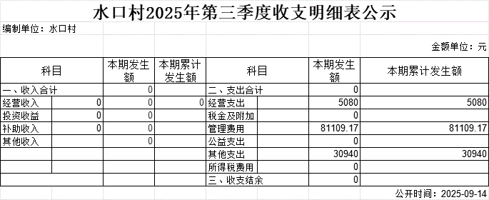 水口村2025年第三季度收支明細表公示