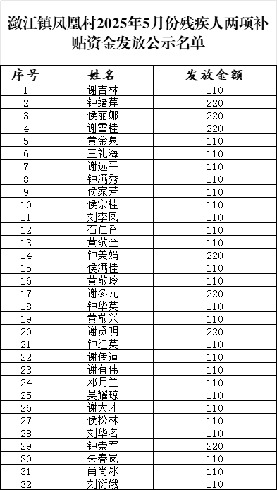 【社會救助】瀲江鎮鳳凰村2025年5月份殘疾人兩項補貼資金發放公示名單