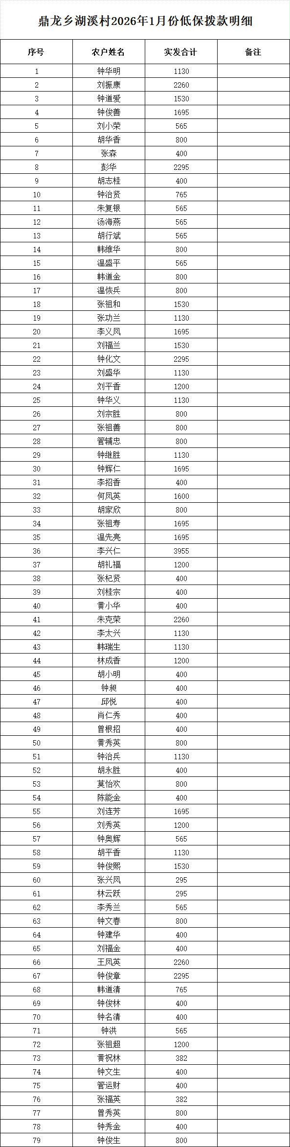 鼎龍鄉(xiāng)湖溪村2026年1月份低保撥款明細