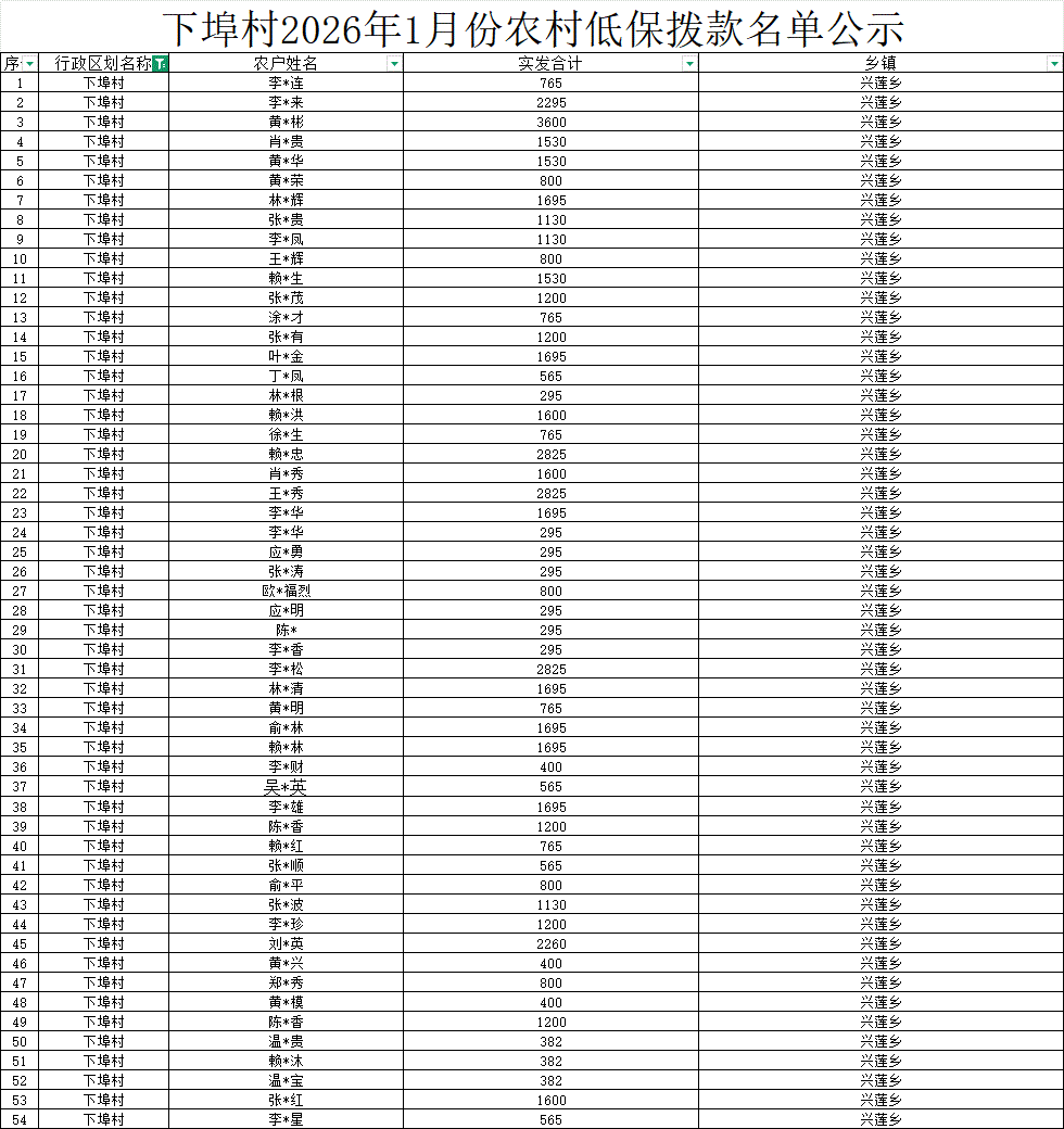 【社會救助】下埠村2026年1月份農村低保撥款名單公示