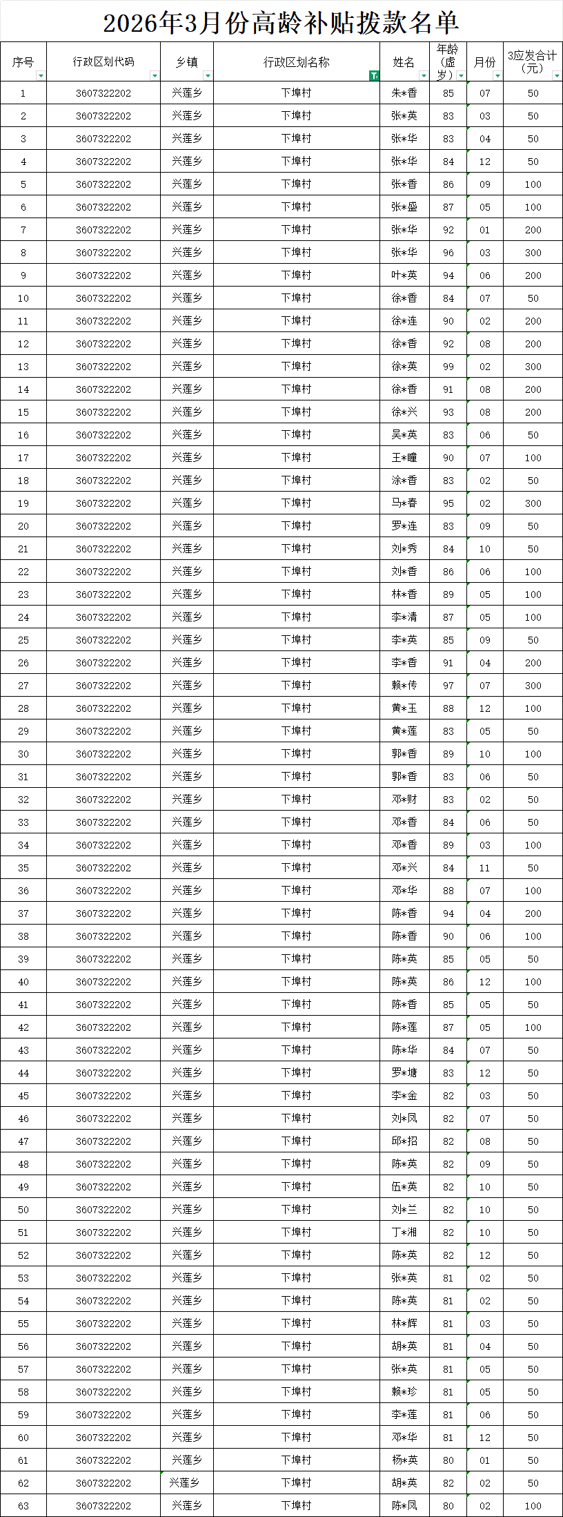 【養老服務】下埠村2026年3月份高齡補貼發放名單