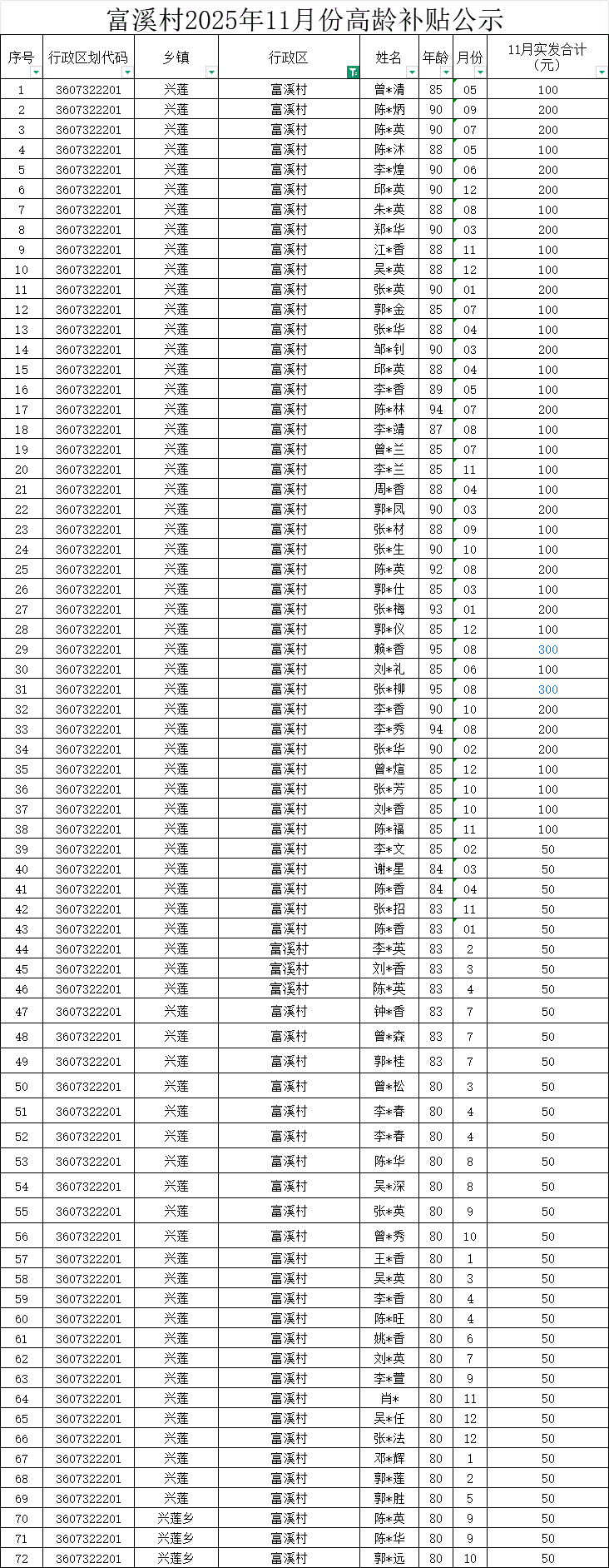 【養老服務】富溪村2025年11月份高齡補貼公示