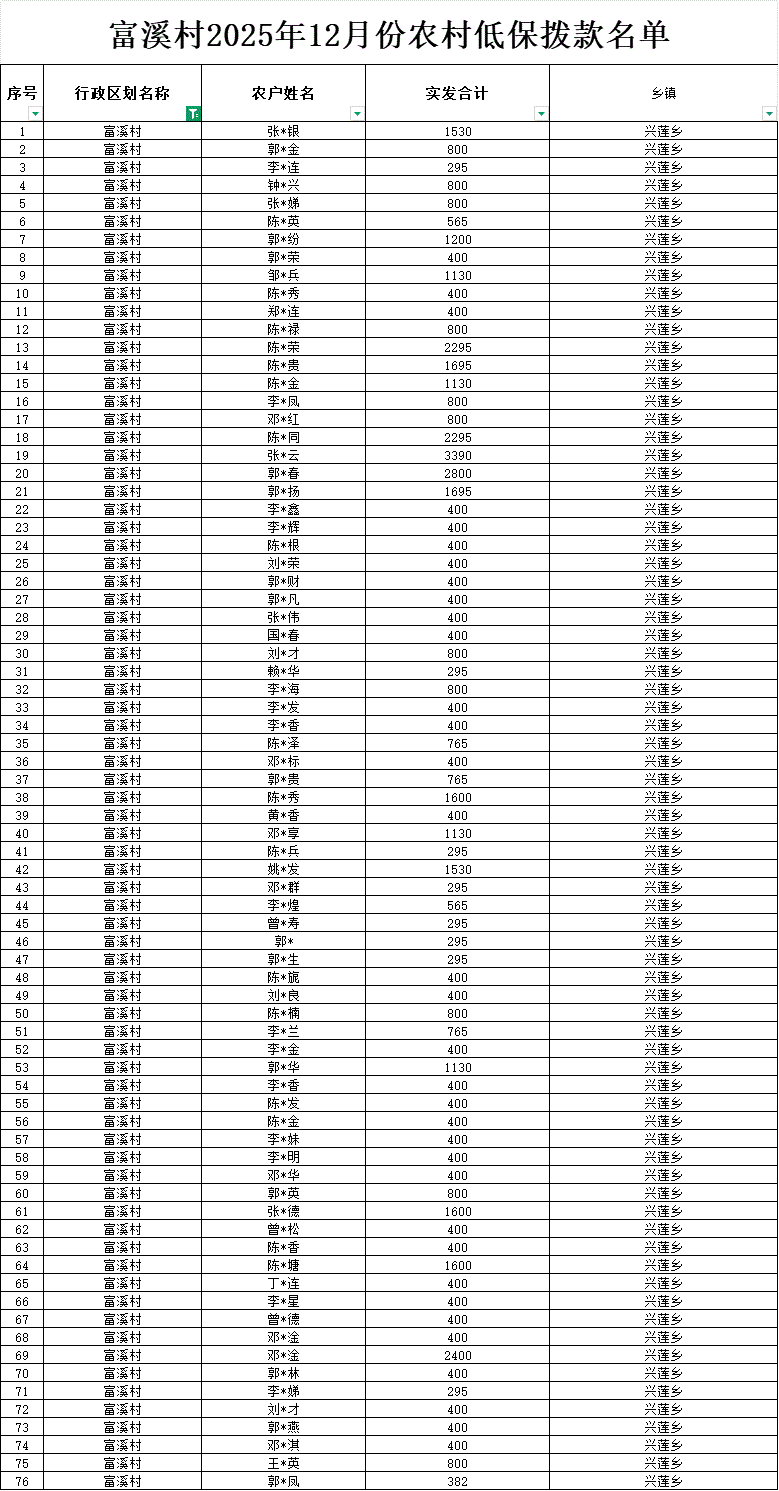 【社會救助】富溪村2025年12月份農村低保撥款名單