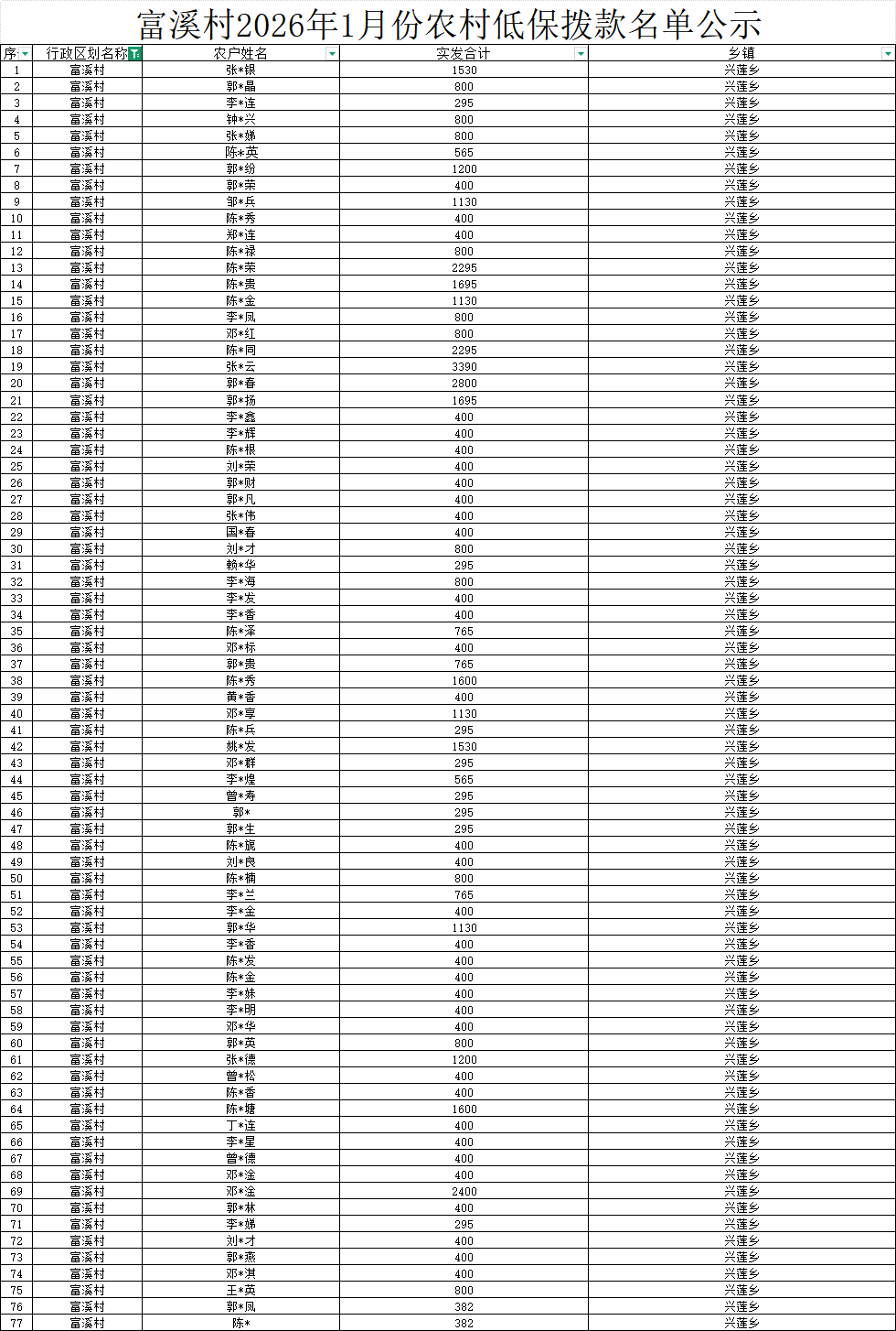 【社會救助】富溪村2026年1月份農村低保撥款名單