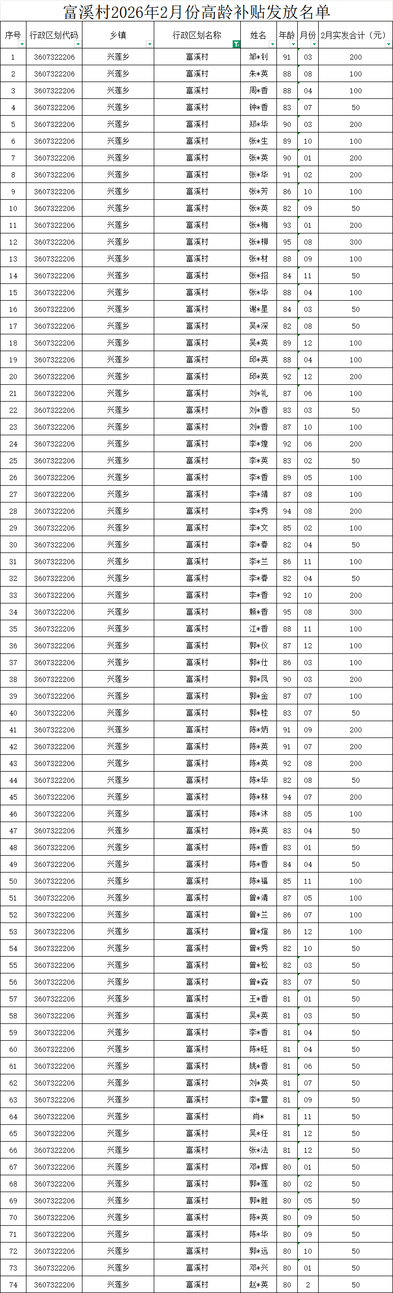 【養(yǎng)老服務】富溪村2026年2月份高齡補貼發(fā)放名單