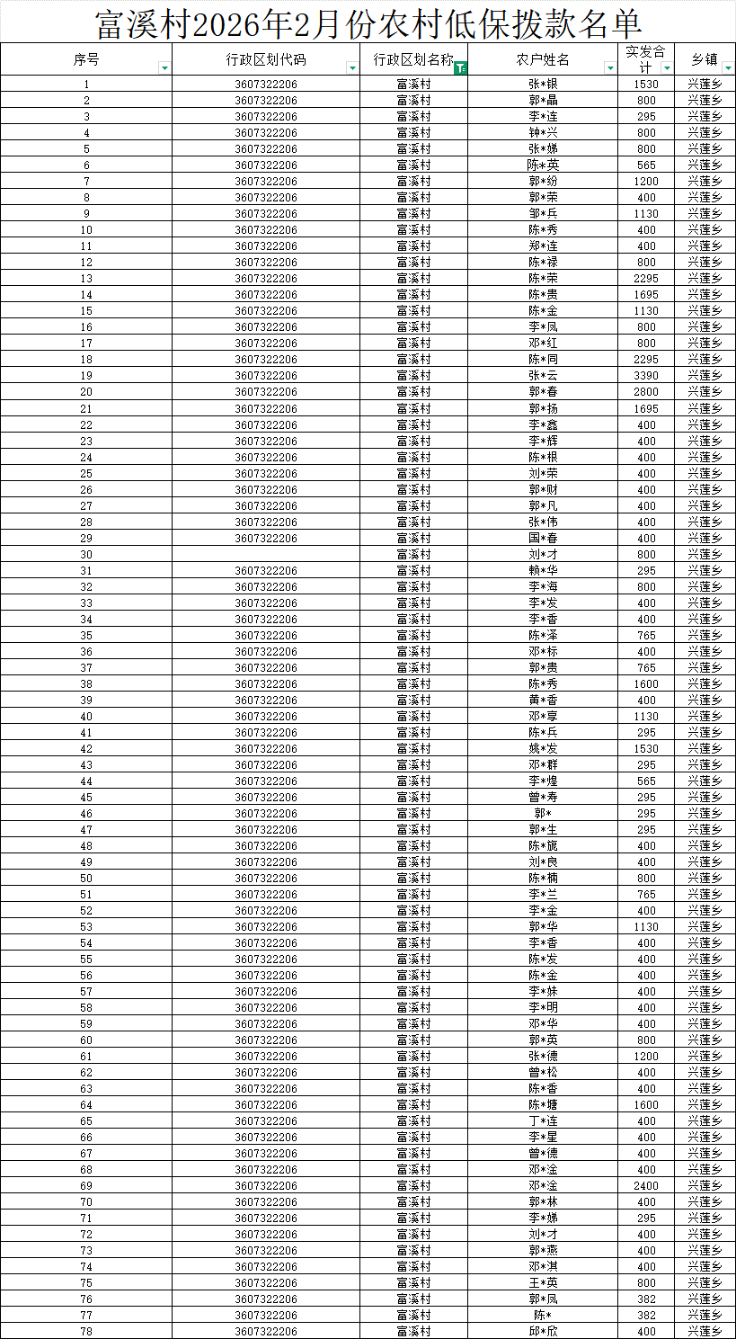 【社會救助】富溪村2026年2月份農村低保撥款名單