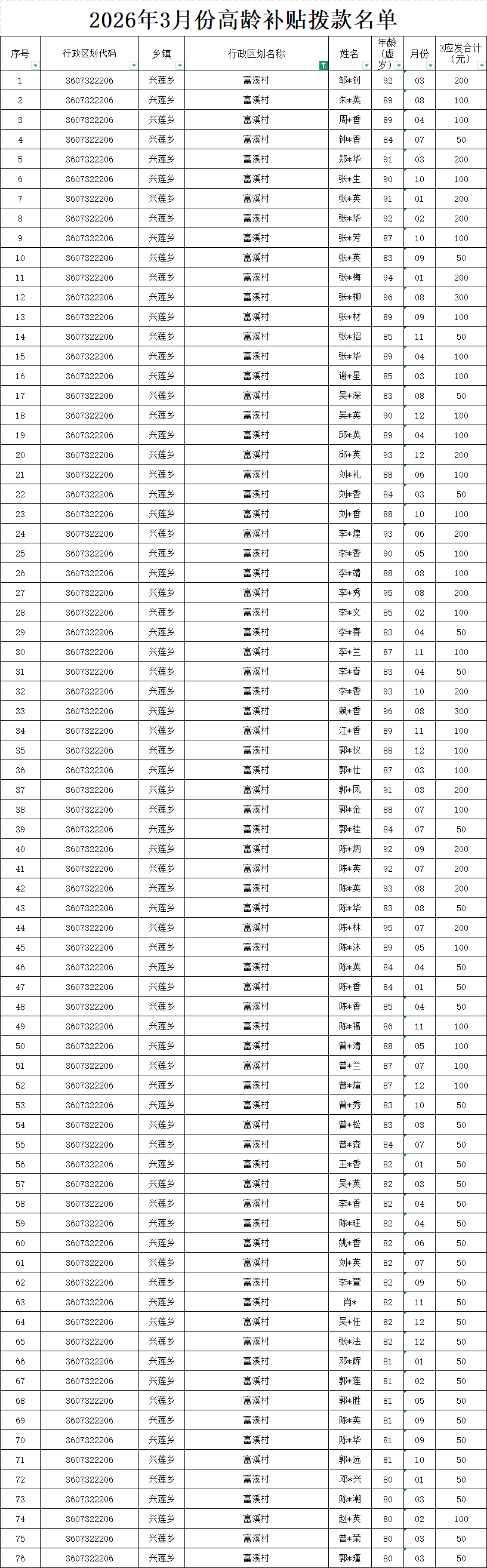 【養老服務】富溪村2026年3月份高齡補貼發放名單