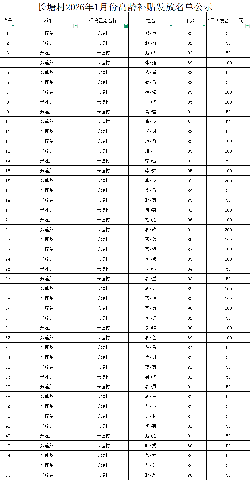 【養老服務】長塘村2026年1月份高齡補貼發放名單