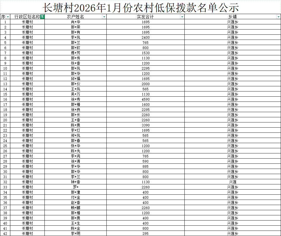 【社會(huì)救助】長(zhǎng)塘村2026年1月份農(nóng)村低保撥款名單公示