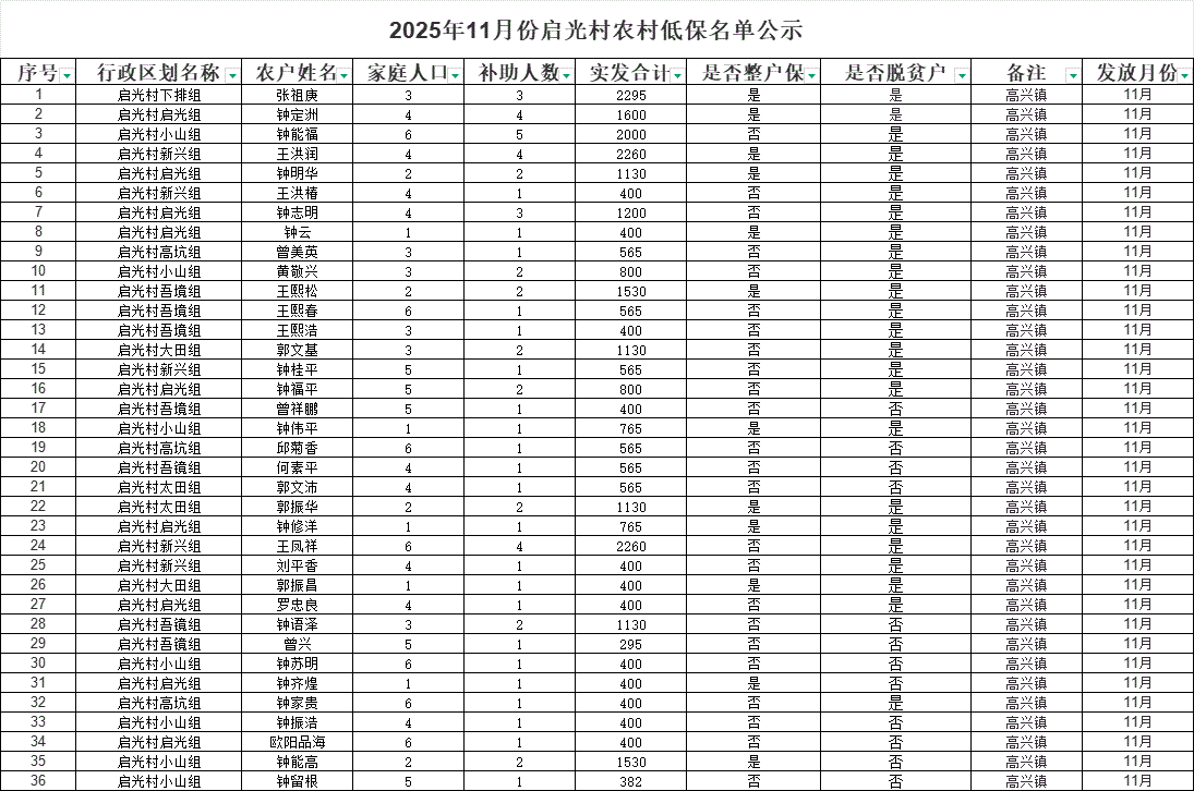 2025年11月份啟光村農(nóng)村低保名單公示