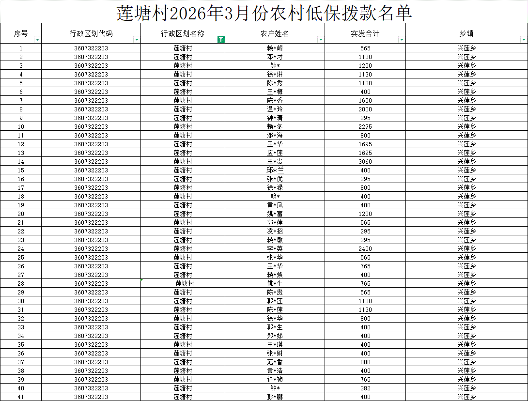 【社會救助】蓮塘村2026年3月份農村低保撥款名單