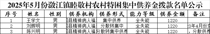 【養老服務】瀲江鎮睦敬村2025年5月份農村特困集中供養金撥款名單