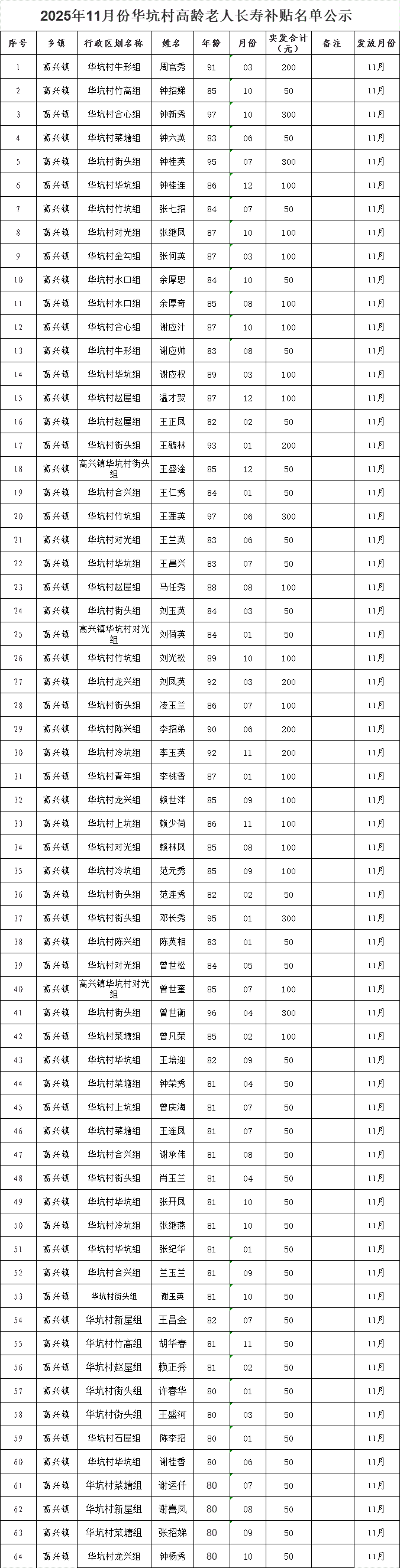 2025年11月份華坑村高齡老人長壽補貼名單公示?