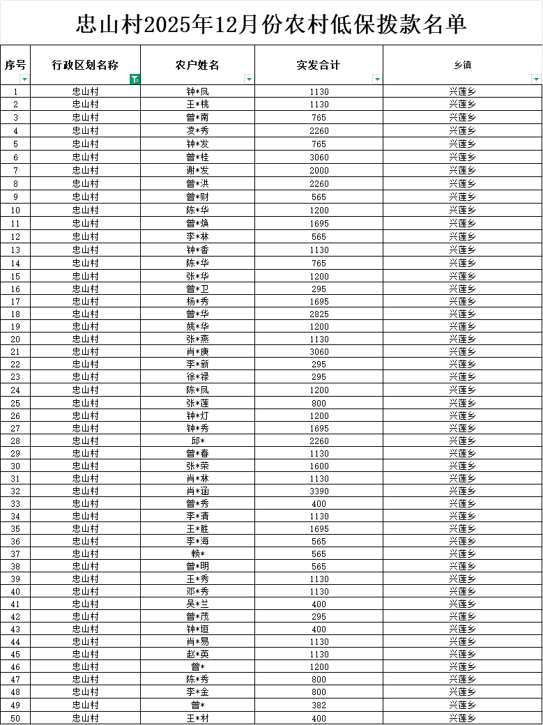 【社會救助】忠山村2025年12月份農村低保撥款名單公示