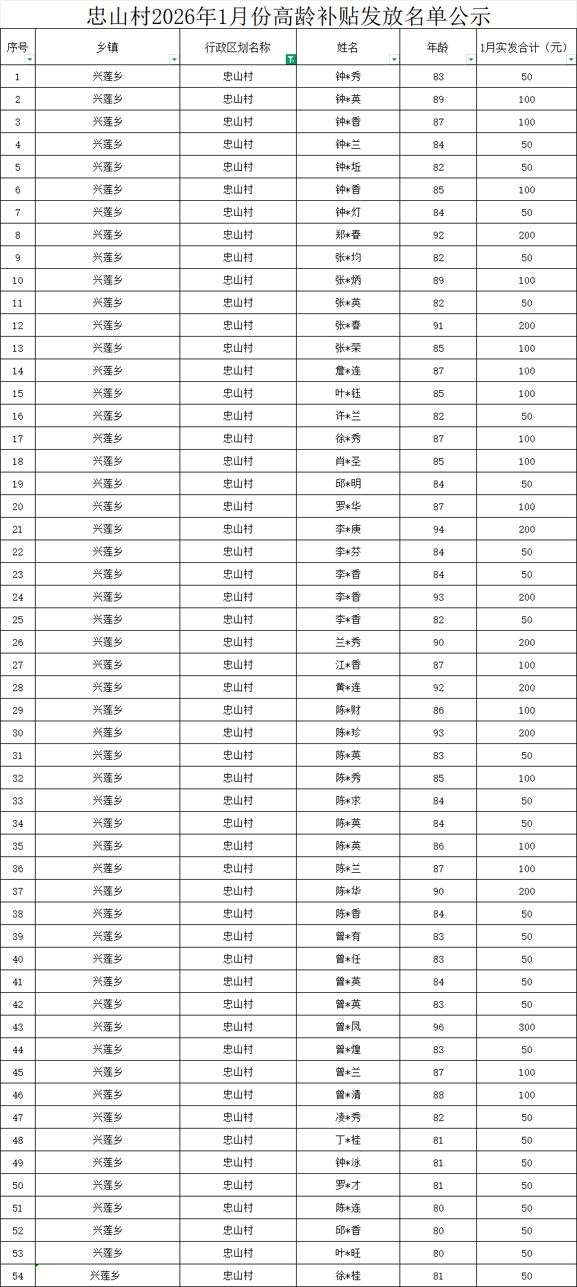 【養老服務】忠山村2026年1月份高齡補貼發放名單公示