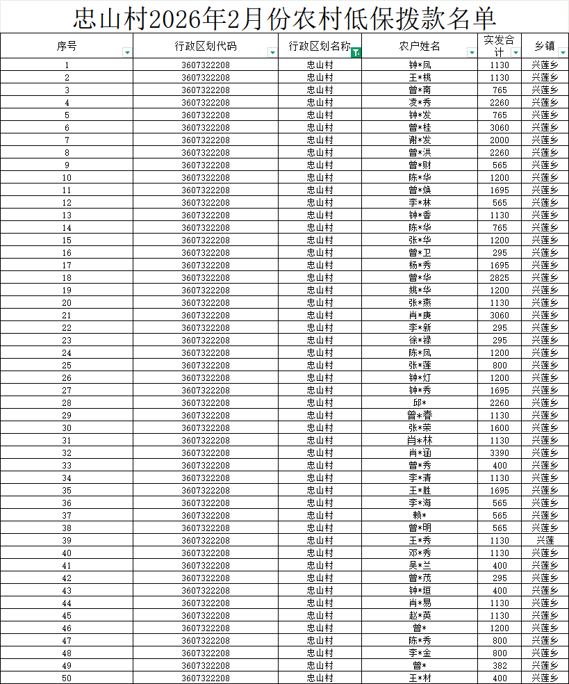 【社會救助】忠山村2026年2月份農村低保撥款名單