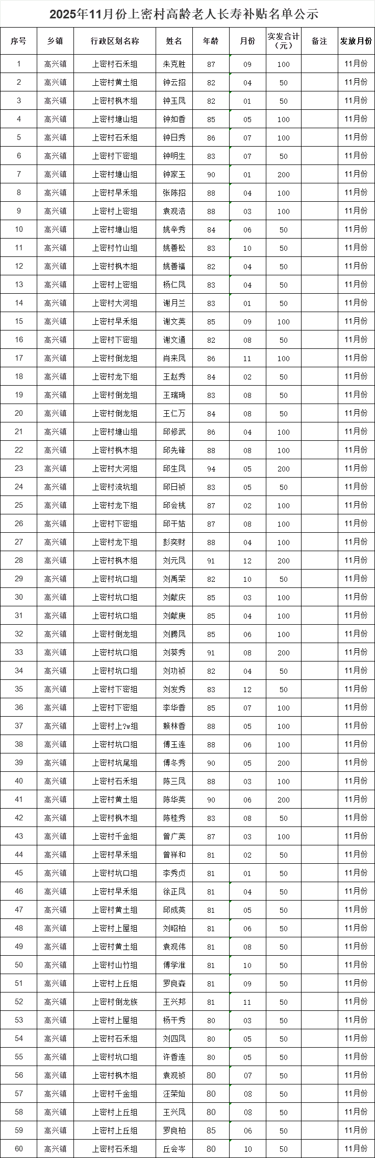 2025年11月份上密村高齡老人長壽補貼名單公示?