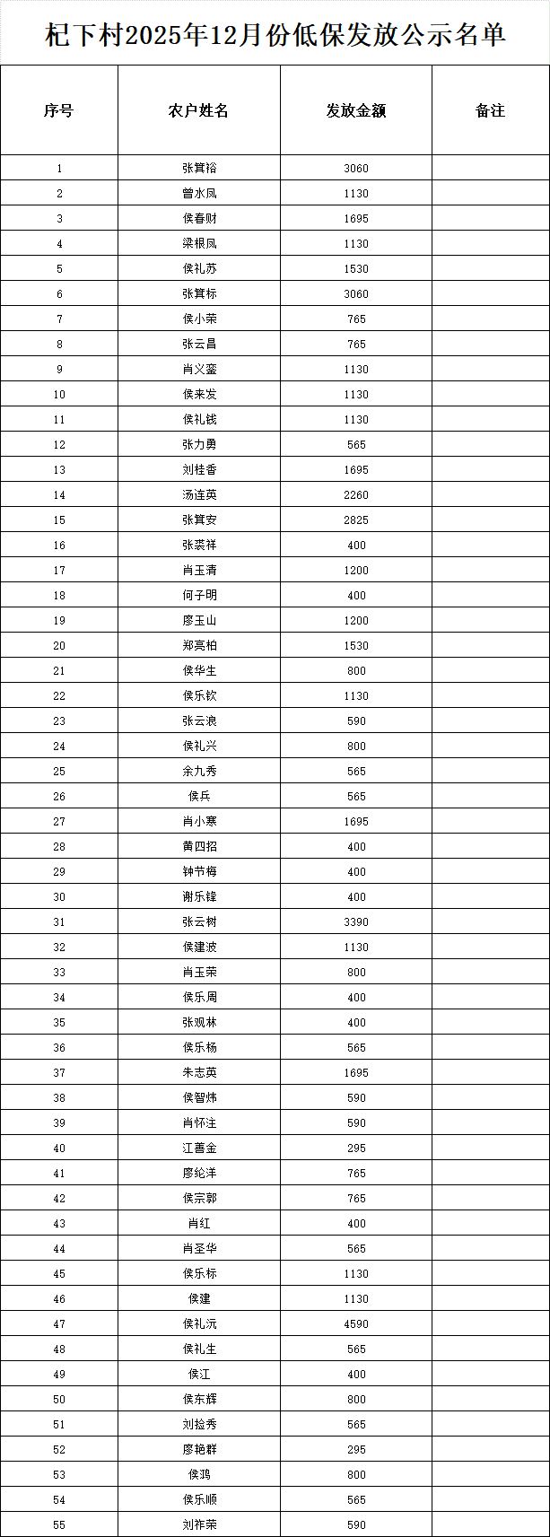 杞下村2025年12月份低保發放公示名單