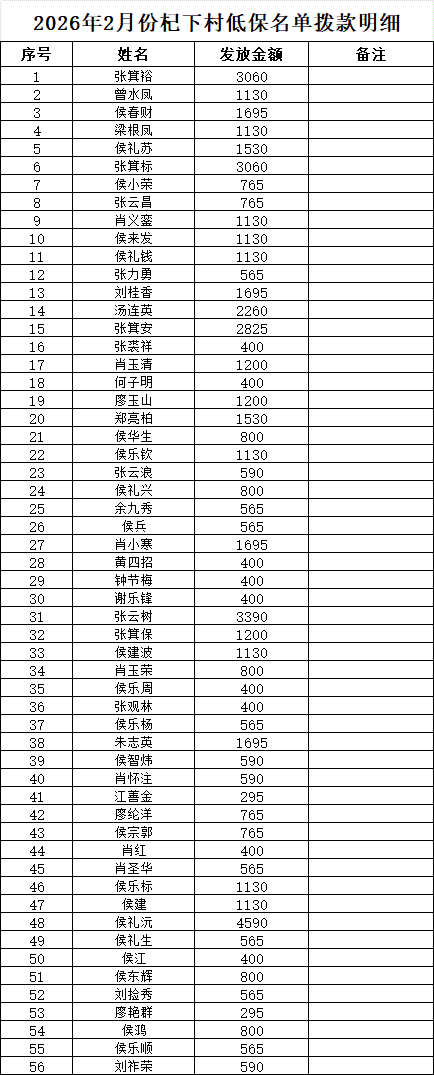 杞下村2026年2月低保名單公示