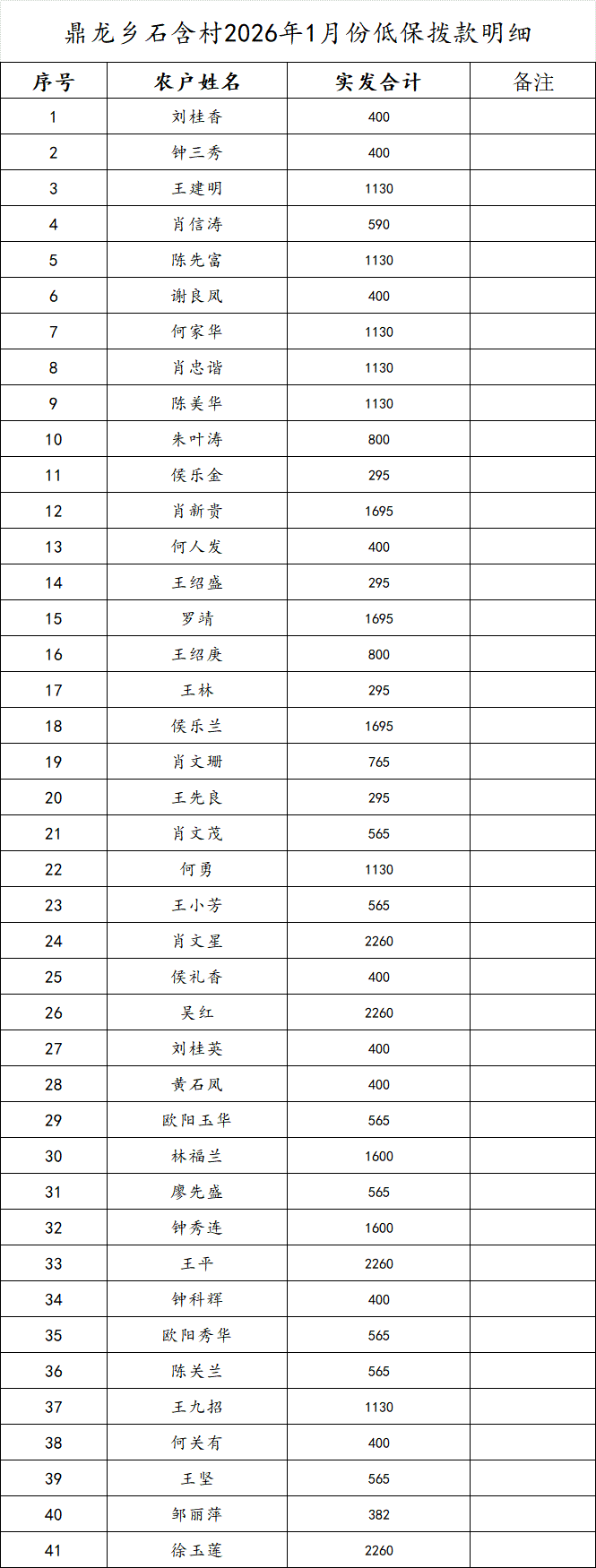 鼎龍鄉(xiāng)石含村2026年1月份低保撥款明細