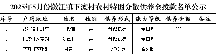 【養老服務】2025年瀲江鎮下渡村農村特困分散供養金撥款名單公示(5月)