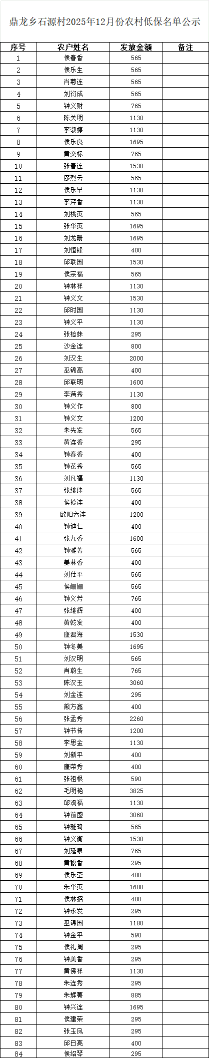 鼎龍鄉石源村2025年12月份農村低保名單公示