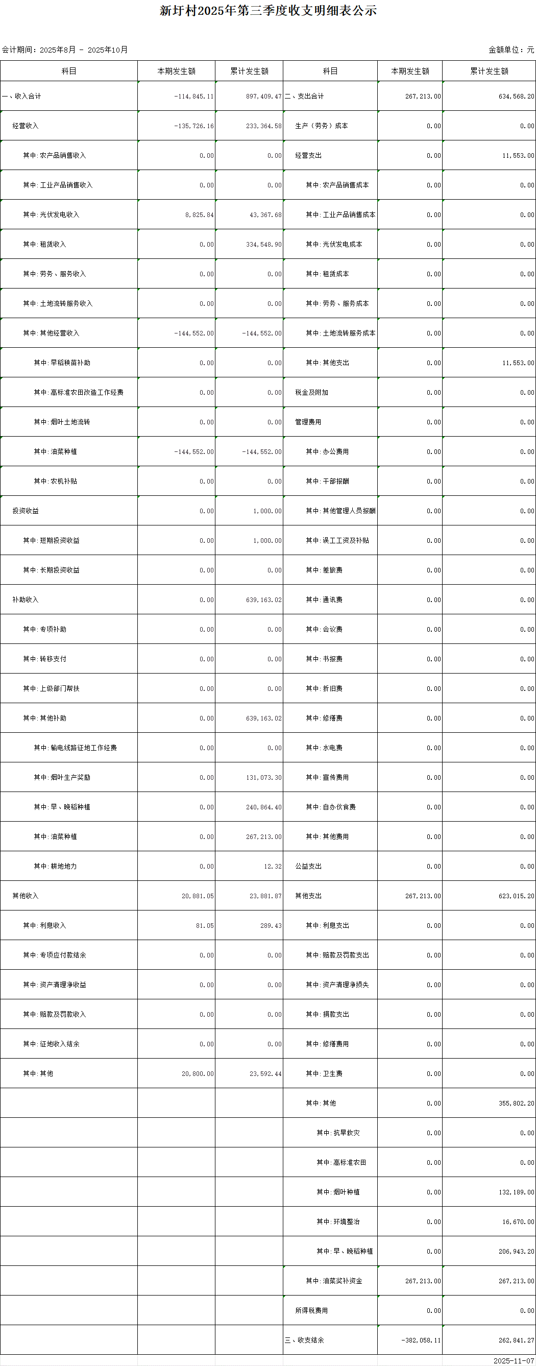新圩村2025年第三季度收支明細表公示