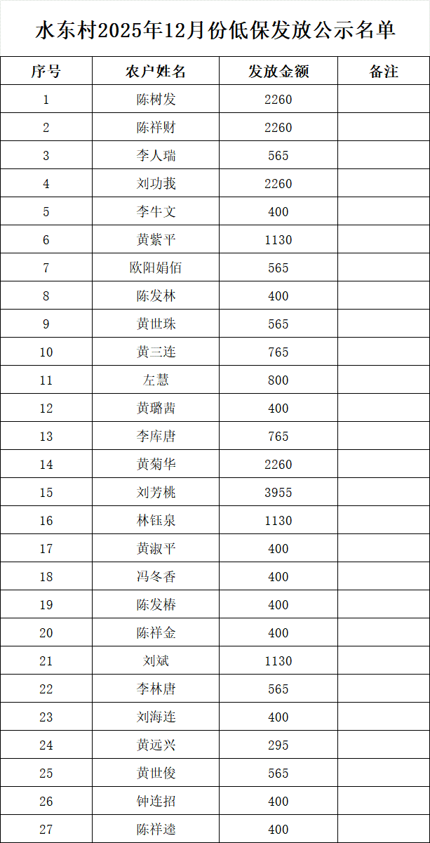 水東村2025年12月份低保發放公示名單