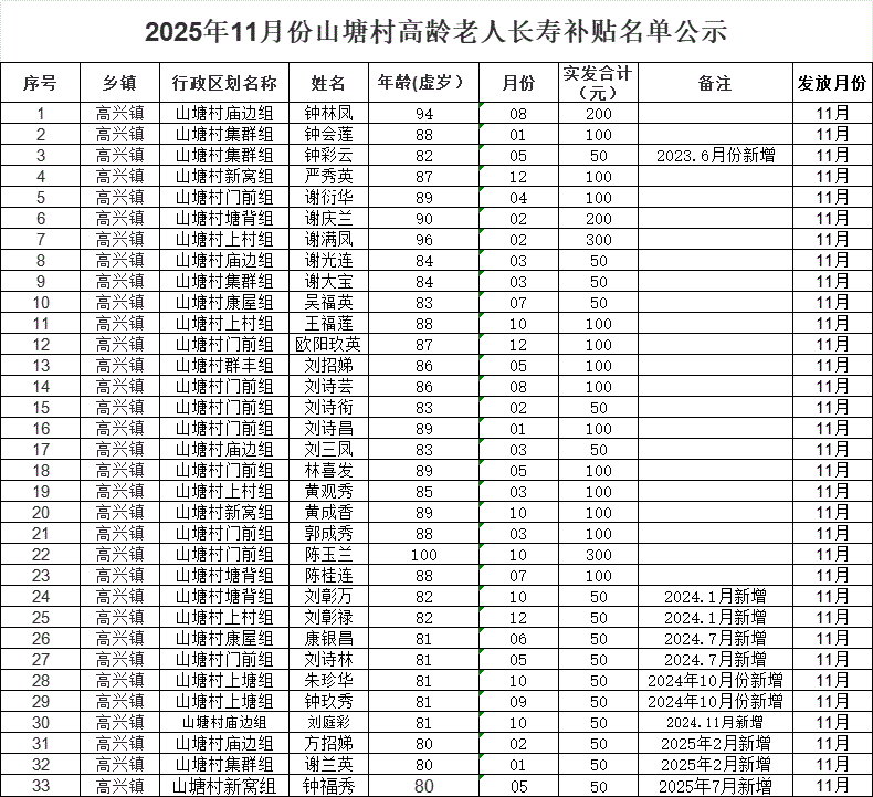 2025年11月份山塘村高齡老人長壽補貼名單公示
