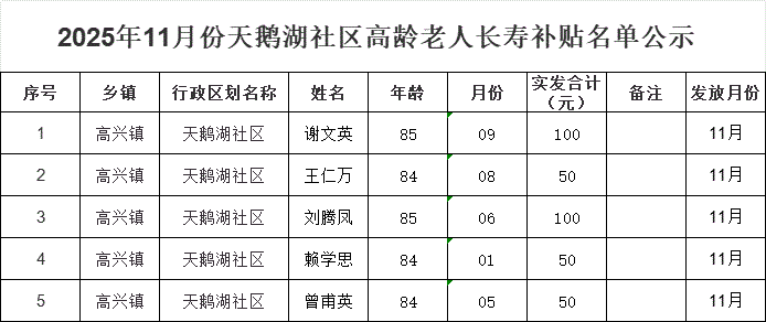 2025年11月份天鵝湖社區(qū)高齡老人長(zhǎng)壽補(bǔ)貼名單公示?