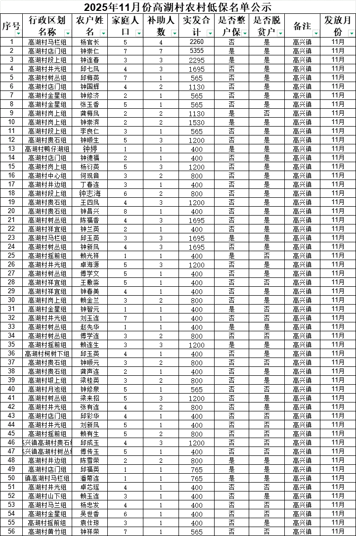2025年11月份高湖村農(nóng)村低保名單公示