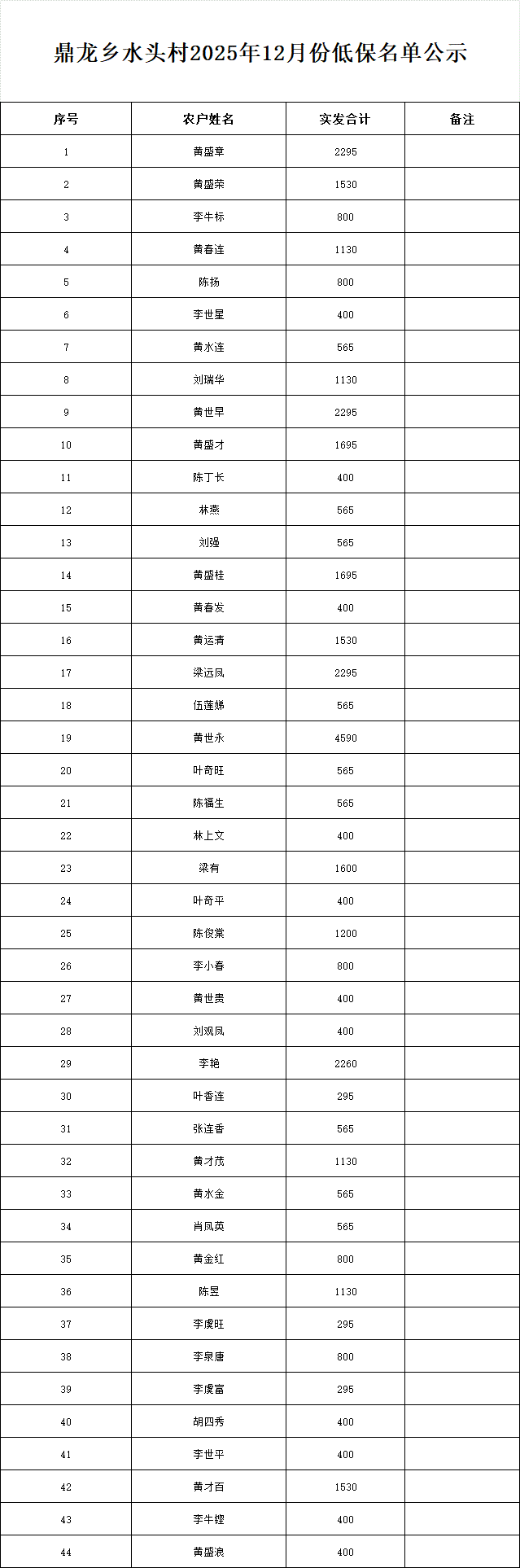 鼎龍鄉水頭村2025年12月份低保名單公示