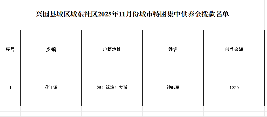 興國(guó)縣城區(qū)城東社區(qū)2025年11月份城市特困集中供養(yǎng)金撥款名單