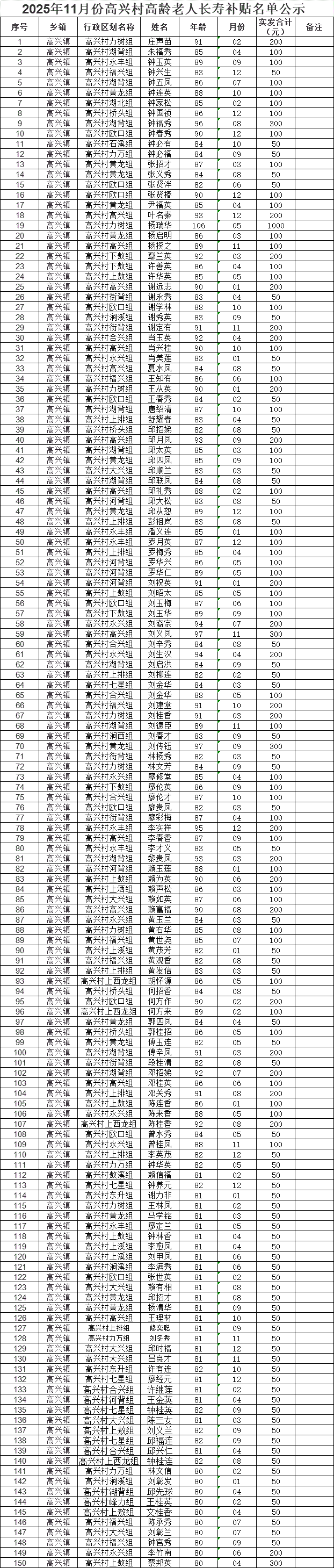 2025年11月份高興村高齡老人長壽補貼名單公示?