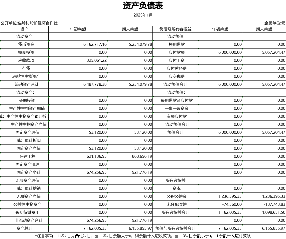 貓嶺村股份經濟合作社2025年1月資產負債表公示
