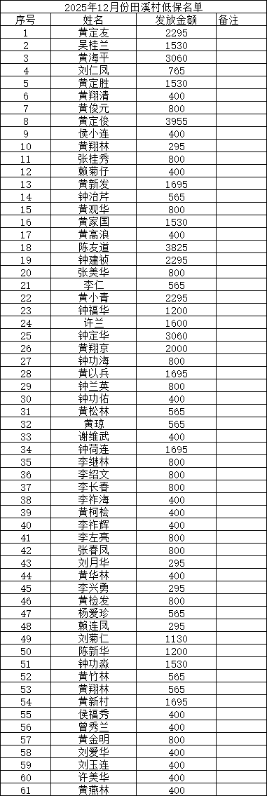 田溪村2025年12月份低保名單