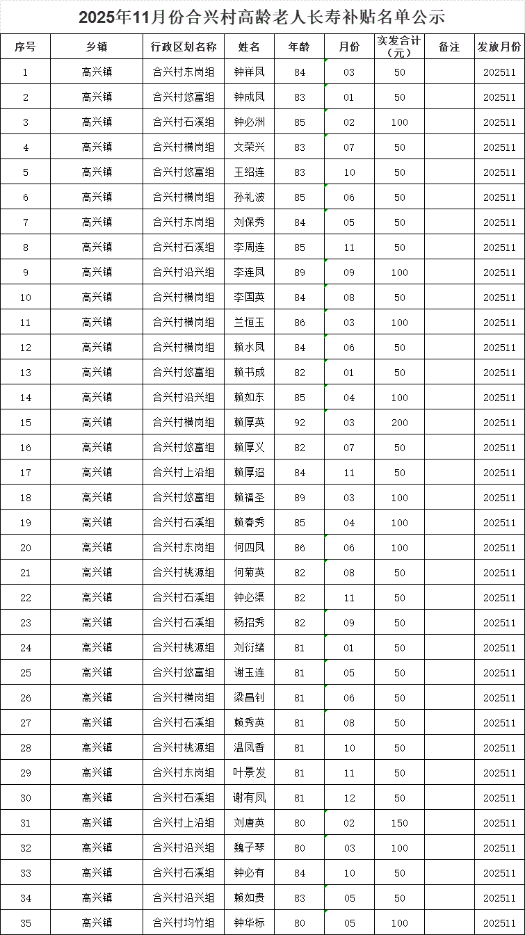 2025年11月份合興村高齡老人長壽補(bǔ)貼名單公示