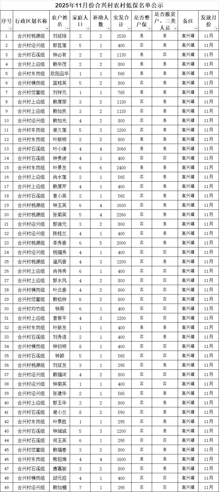 2025年11月份合興村農(nóng)村低保名單公示