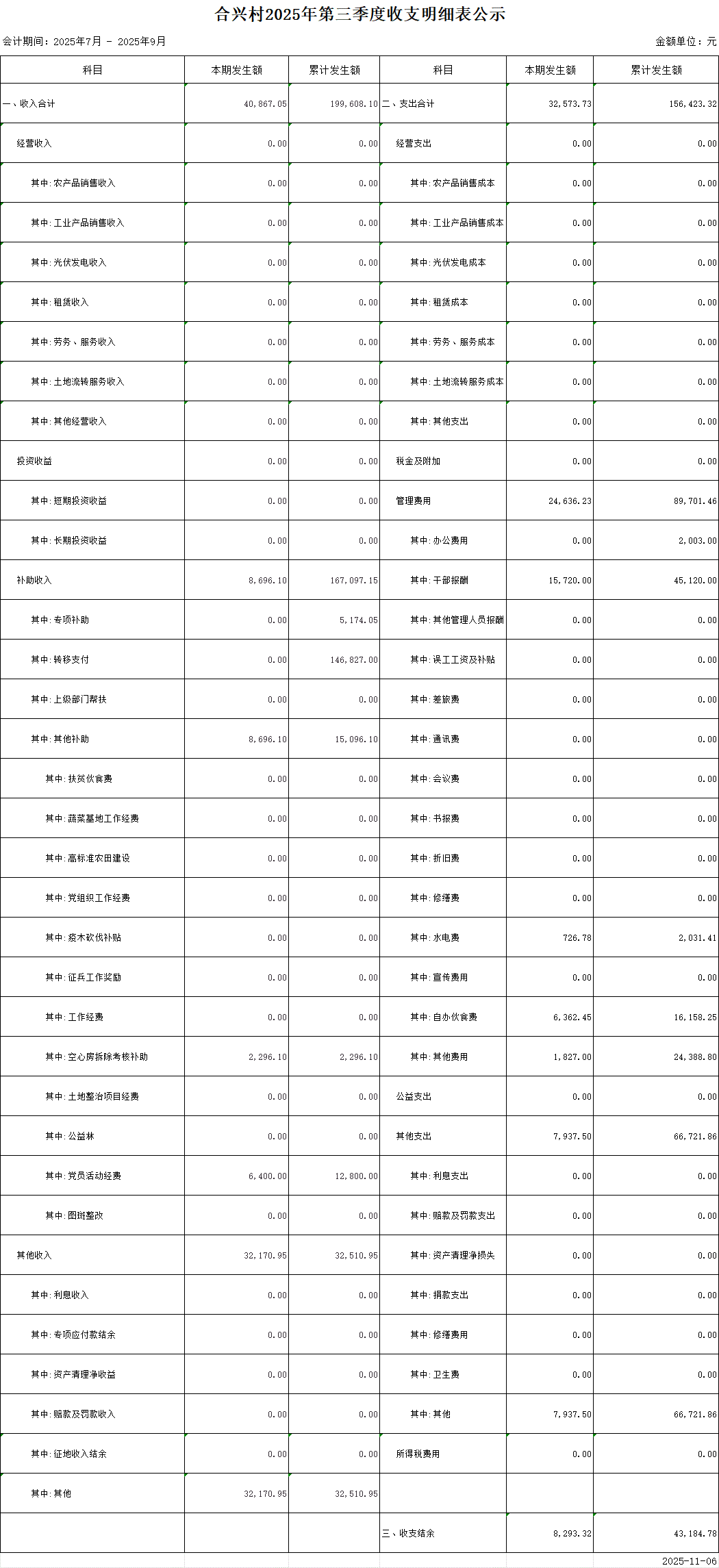 合興村2025年第三季度收支明細表公示