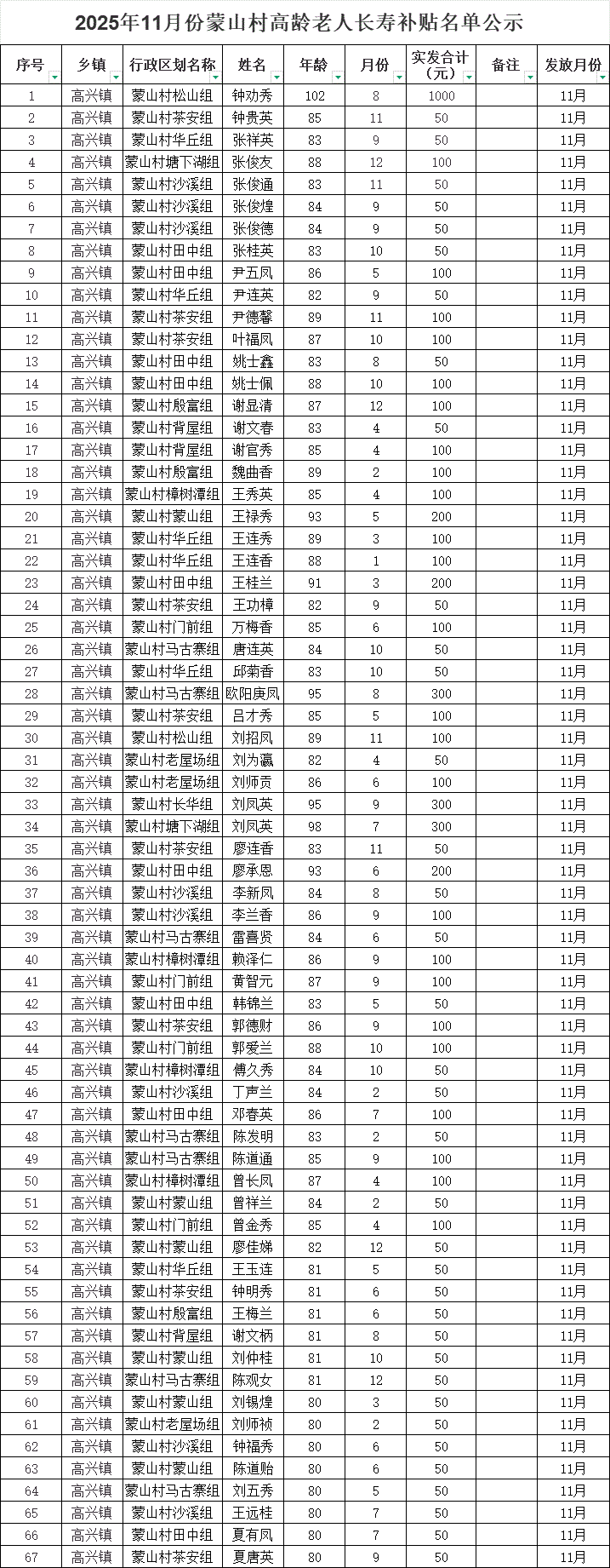 2025年11月份蒙山村高齡老人長壽補貼名單公示?