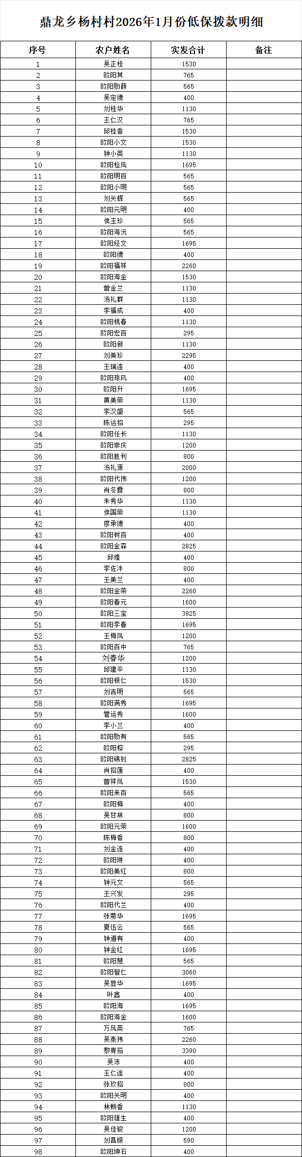 鼎龍鄉楊村村2026年1月份低保撥款明細