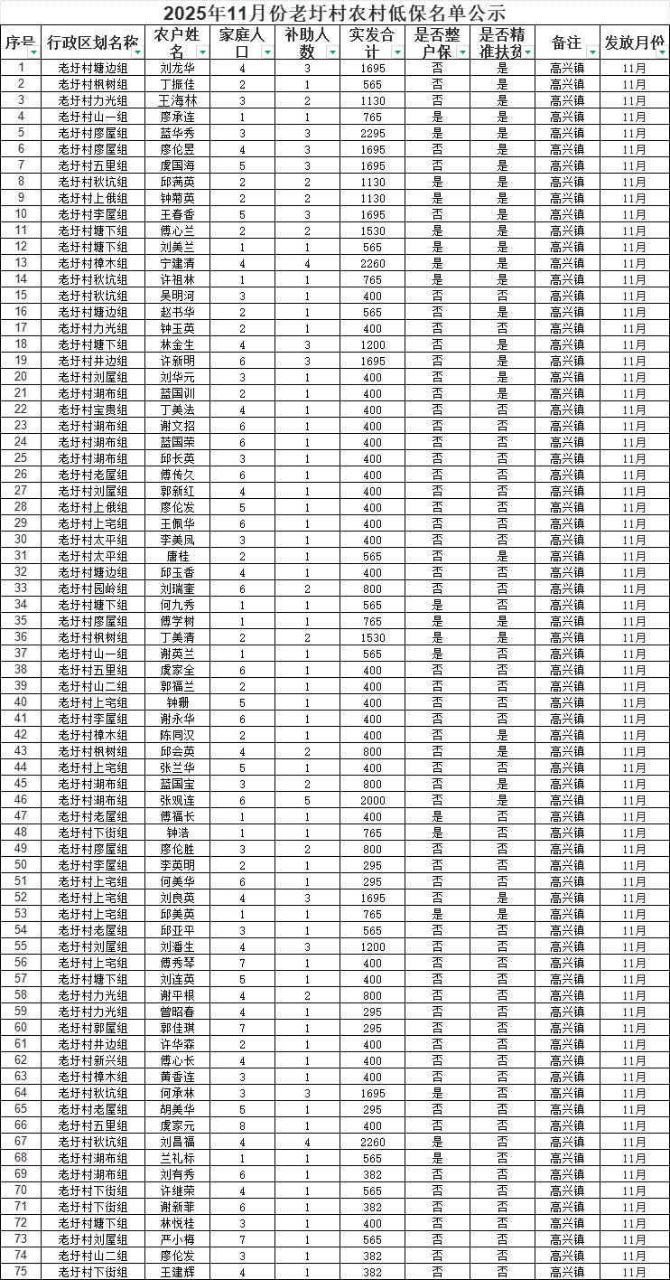 2025年11月份老圩村農村低保名單公示