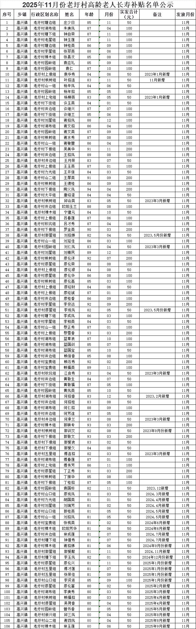 2025年11月份老圩村高齡老人長壽補貼名單公示