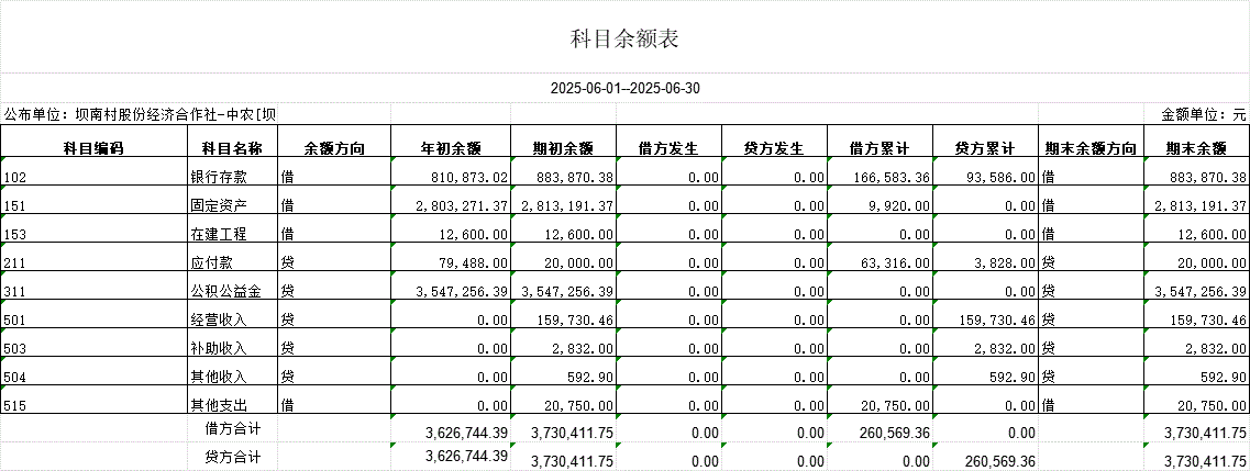 壩南村股份經(jīng)濟(jì)合作社2025年6月財(cái)務(wù)公開