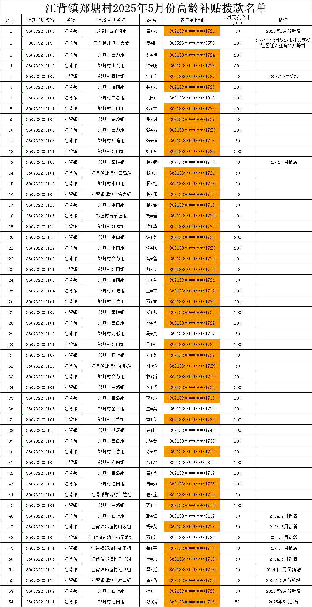 【養(yǎng)老服務(wù)】江背鎮(zhèn)鄭塘村2025年5月份高齡補(bǔ)貼撥款名單